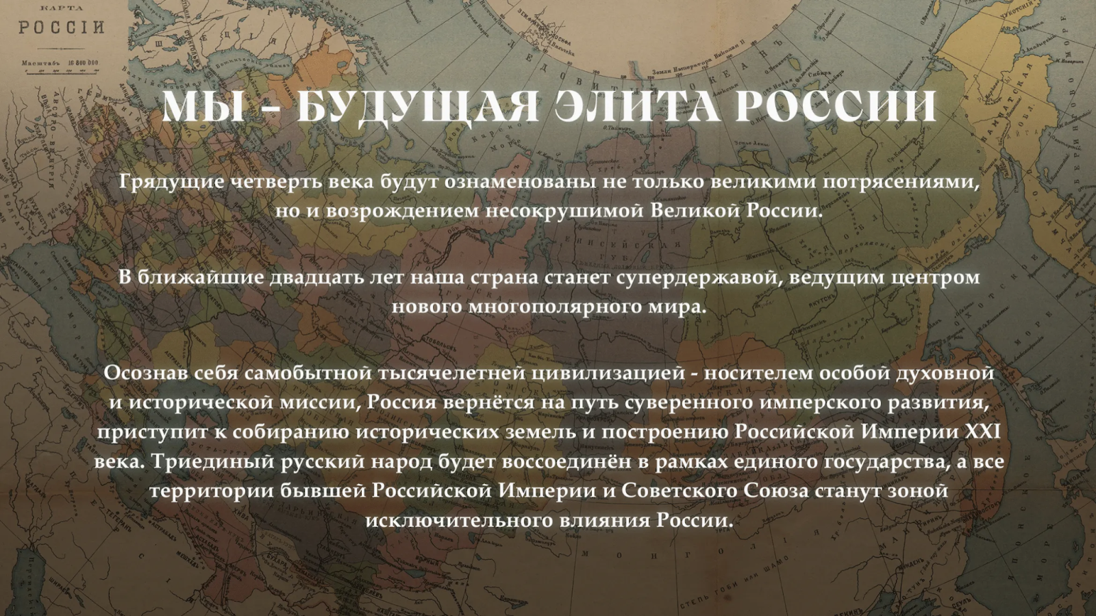 We can take the position of a reserve. We are preparing ideological personnel in our paradigm, whom we can promote. If the personnel meet the criteria: they are not just good Russian people who love the black-yellow-white flag, but those who are capable of writing documents, working with programs, and so on. Then we promote them. We have successful cases — guys who are assistants to deputies, employed in city administrations, in youth parliaments. Gradually, work is progressing, but the state is not in a hurry to share its resources.”