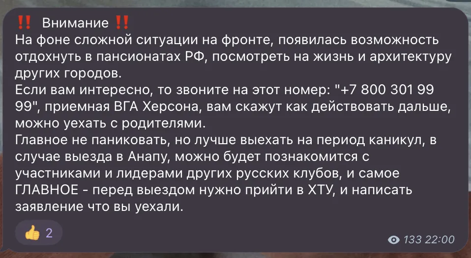 The Academists also set up cells in occupied Ukrainian territories. However, following Ukraine’s counteroffensive in autumn 2022, these cells had to evacuate. The Brotherhood’s Telegram channel described the evacuation of the Kherson “Russian Club” as a “vacation trip to Russia”.