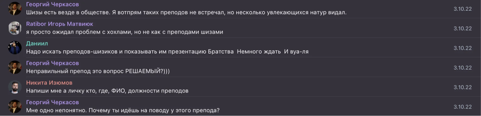 If the teachers do not agree or are not ready to support such groups, the Brotherhood leadership may try other negotiation tactics. This screenshot, for example, shows members of the Brotherhood discussing the ‘resolvable’ issue posed by an unnamed ‘uncooperative’ professor during their effort to establish a club in Kherson which at the time was occupied by the Russian army.