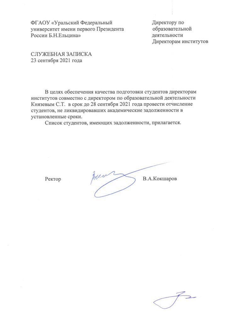 23 сентября ректор Кокшаров подписал служебную записку о массовых отчислениях. В список только в одном гуманитарном институте вошло больше 940 студентов бакалавриата, магистратуры и специалитета. Попали в этот список те, кто был с двумя и более долгами.