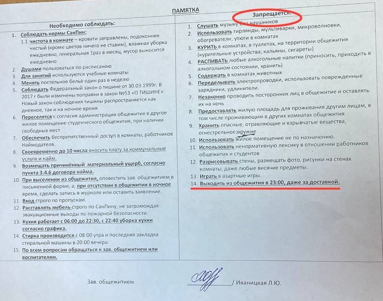 Больше всего сейчас напрягает комендантский час до 22:00. Банально не успеваешь съездить по делам или вернуться с концерта к этому времени. В общаге сразу говорят, все, мол, комендантский час — ты опоздал. Заставляют писать объяснительные и проводят воспитательные беседы, могут забрать пропуск.