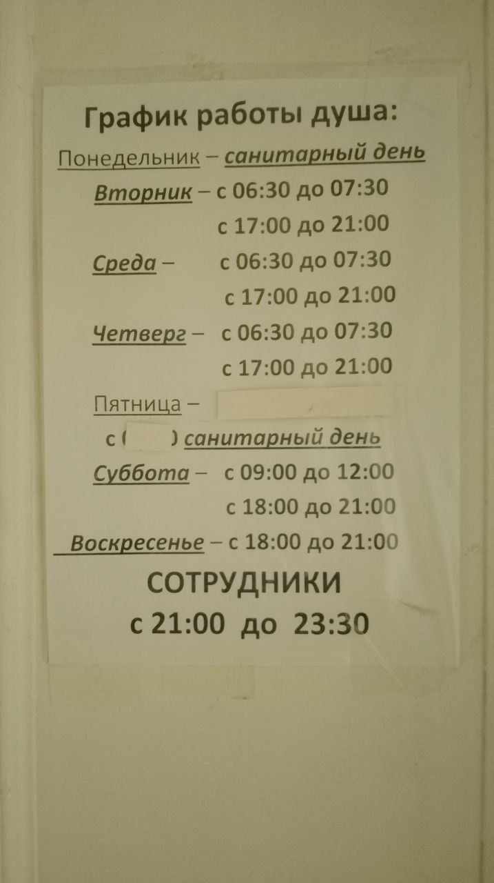 — Еще одна наболевшая проблема — душ, он не работает круглосуточно. Туда можно прийти по расписанию: пять дней в неделю, а в понедельник и пятницу душ закрыт полностью — это санитарные дни. При этом в будние дни душ по утрам работает всего час, в субботу вообще открыт только с утра. Бывает так, что попасть в душ ты просто не успеваешь. Можешь занять очередь, просидеть полчаса, а потом придут и скажут: «Душ закрывается, вы не успели. Сами виноваты».