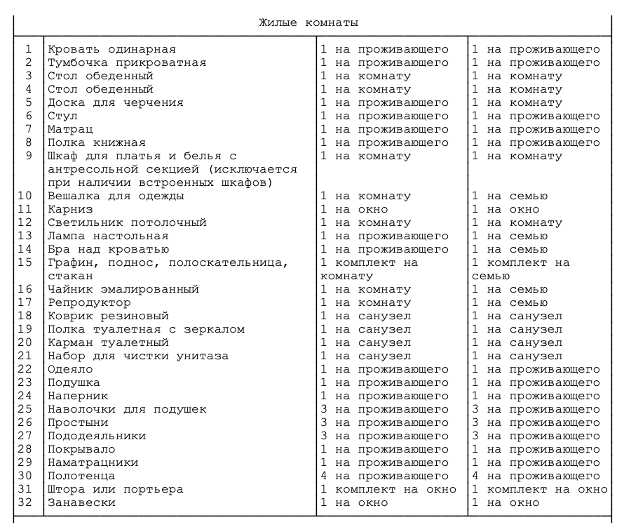 На каждого человека в общажной комнате должно быть не менее шести квадратных метров. То есть: комнаты на двух человек не могут быть меньше 12 м², а на трех — менее 18 м². В этот метраж не входят помещения общего пользования: кухня, туалет, коридоры, прачечные. Это регулирует статья 105 Жилищного кодекса РФ.