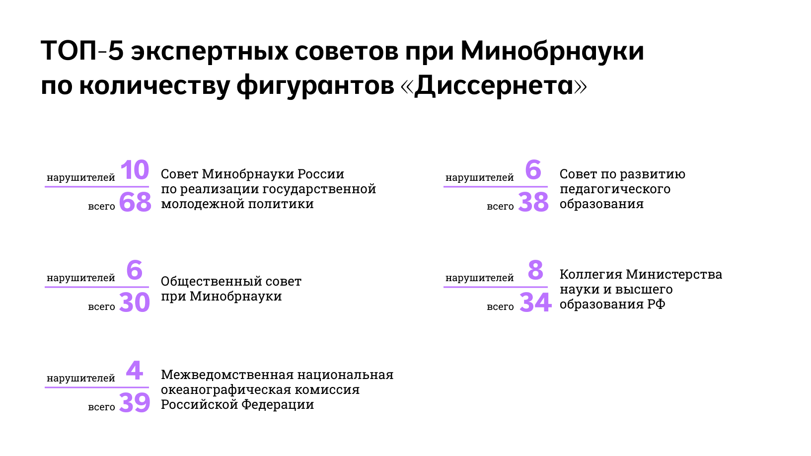 Судя по информации из баз данных «Диссернета», в трех советах Минобрнауки может не быть нарушителей академической этики — в Совете по цифровому развитию и ИТ, в Совете по развитию исторического образования и в Комиссии по координации работ по разработке подзаконных нормативных правовых актов.