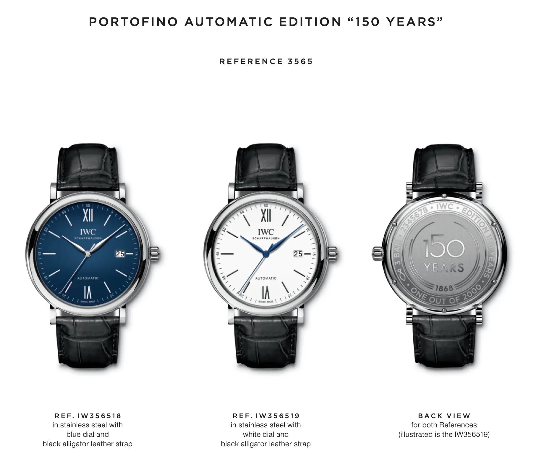 Называются IWC Portofino Automatic Edition «150 Years». Конкретно эта модель лимитированная: всего таких часов выпустили в количестве 2000 штук к 150-летию компании-производителя из «недружественной» Швейцарии. Вот скрин из каталога: