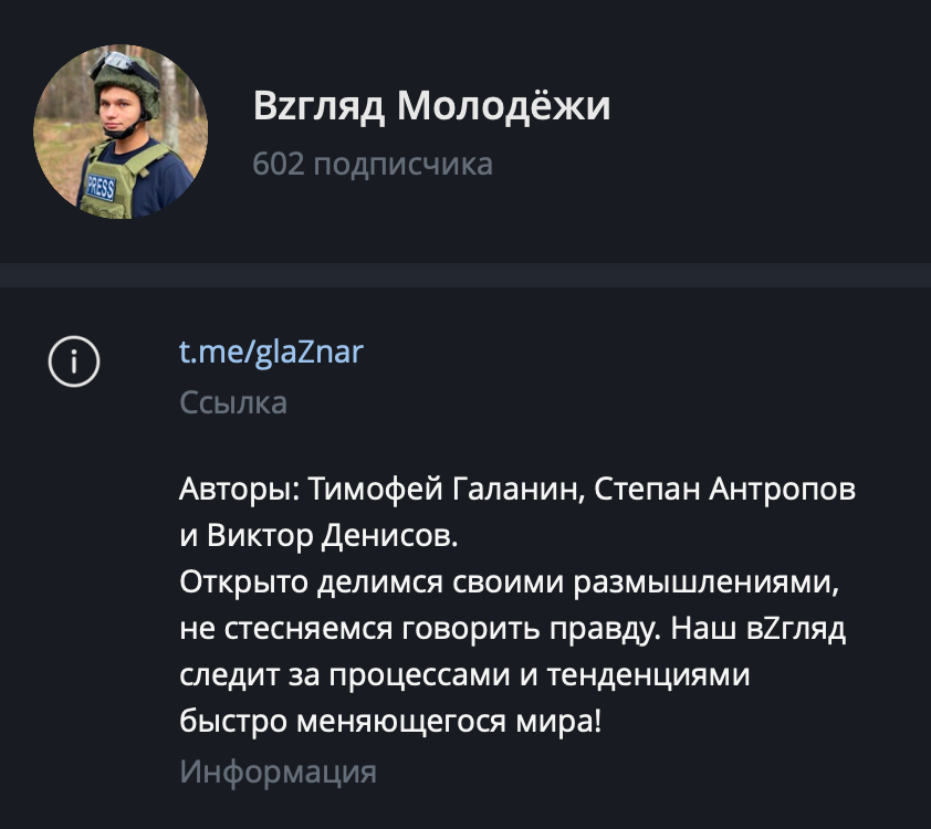 Прогосударственные я смотрю не так много. Чаще всего — «Ридовку», «Вzгляд Молодёжи» (Прим. ред. — телеграм-канал Степана Антропова и его единомышленников), «Абзац», «Бесогон ТВ», [Юрия] Подоляку (Прим. ред. — Юрий Подоляка, журналист, ведет свой канал на Ютубе и выступает на «Первом канале» как «эксперт» по украинской политике), [Владислава] Позднякова (Прим. ред. — Владислав Поздняков, лидер экстремистского движения «Мужское государство», которое занимается травлей, угрозами и преследованиями женщин и ЛГБТ-людей).