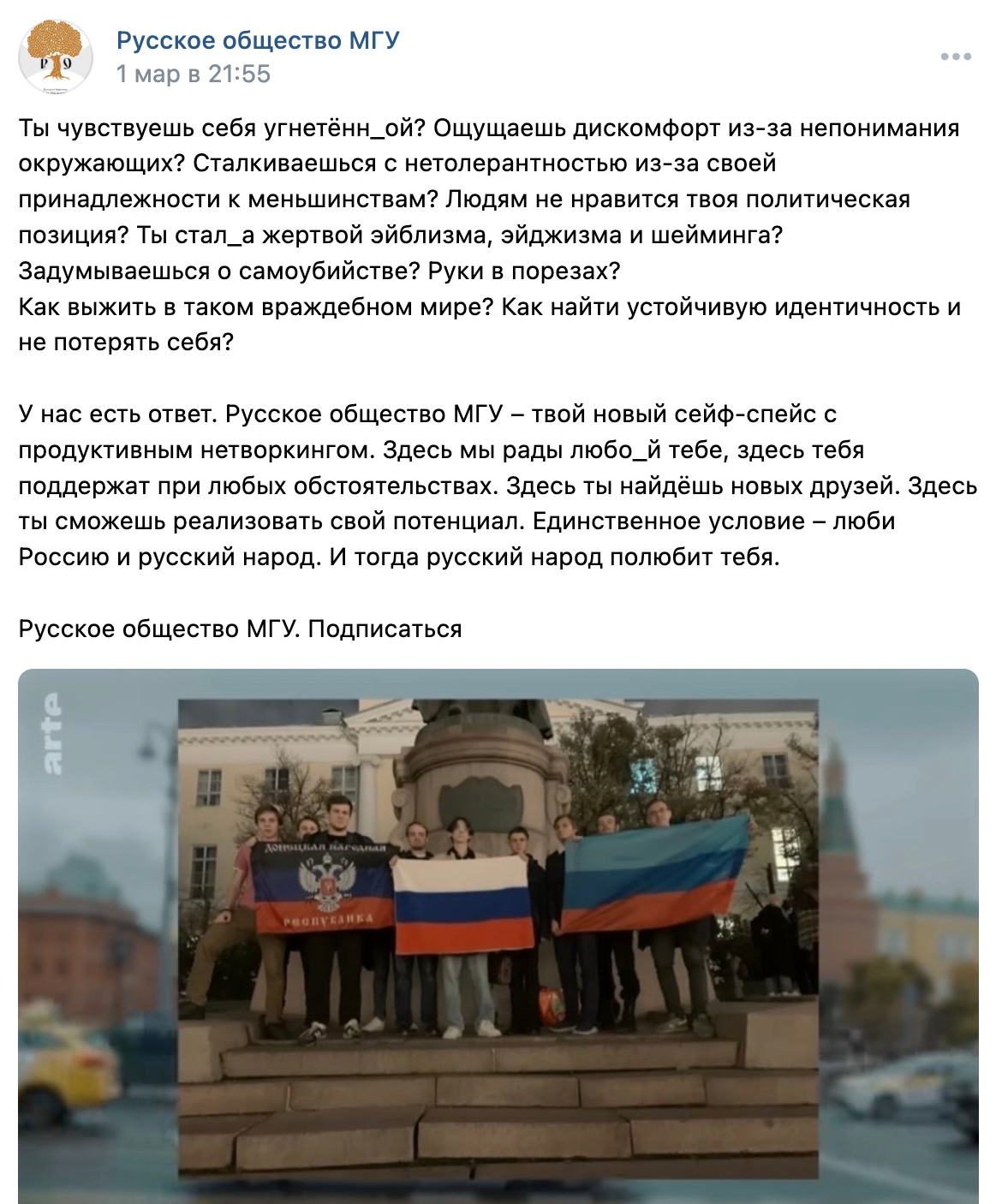 Сейчас действительно формируется патриотически настроенное объединение. В частности, у нас в университете есть замечательное «Русское общество МГУ». Это как раз-таки объединение ребят с патриотической позицией, которые готовы отстаивать интересы своей Родины.